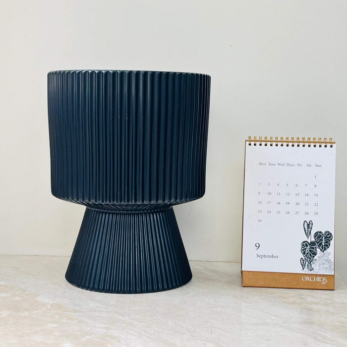 Black Ribbed Ceramic Planter with Flared Base – Modern Decorative Pot