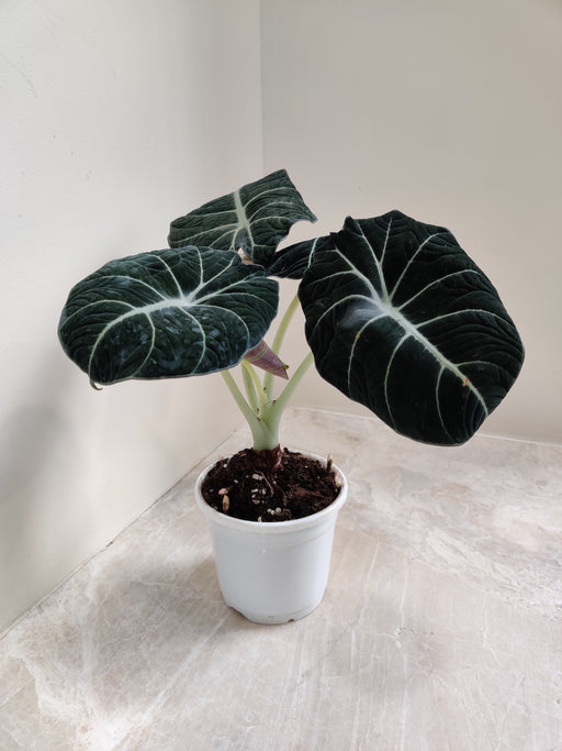 Alocasia Black Velvet is an indoor plant with striking black foliage. Its compact size and velvet-like texture make it perfect for small spaces.