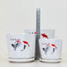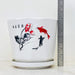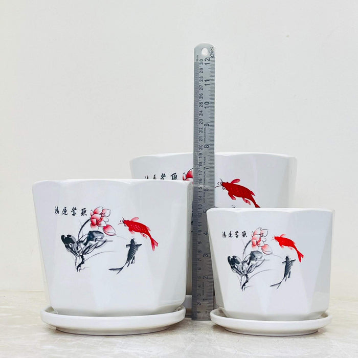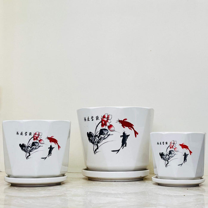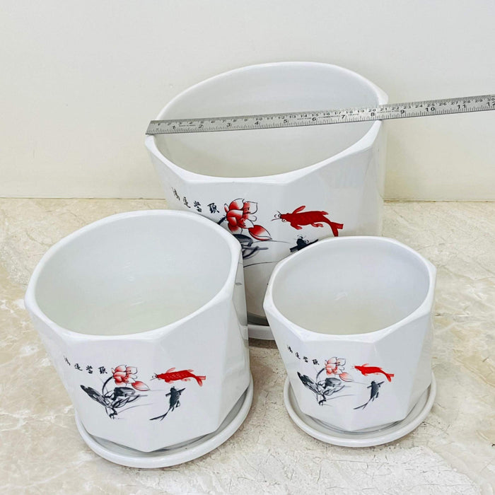 Set of three white ceramic pots adorned with an elegant Asian-inspired design featuring koi fish and floral art in black and red.