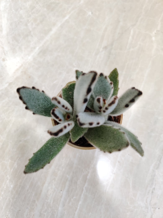 This stemmed variety has long, upright leaves colored silvery green with spots of chocolate brown dotting their edges.