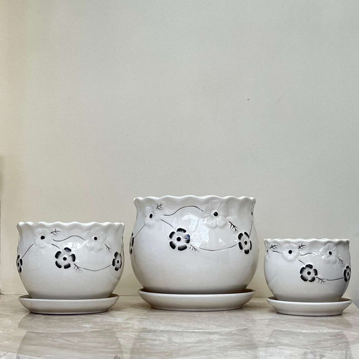 Elegant White Ceramic Pots with Black Floral Patterns (Set Of 3)