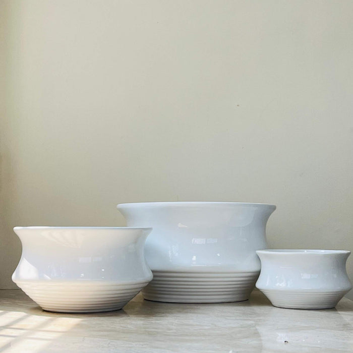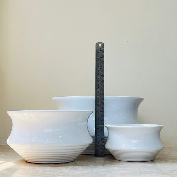 White Flared Ceramic Planters - Set of 3 with Ribbed Base